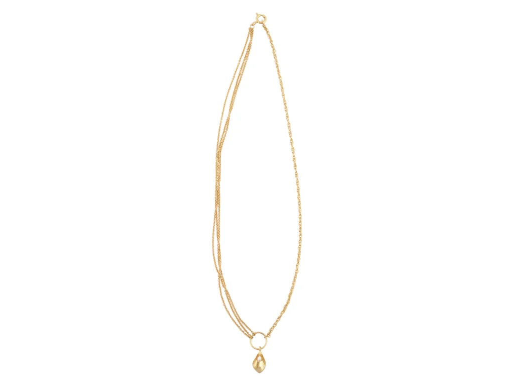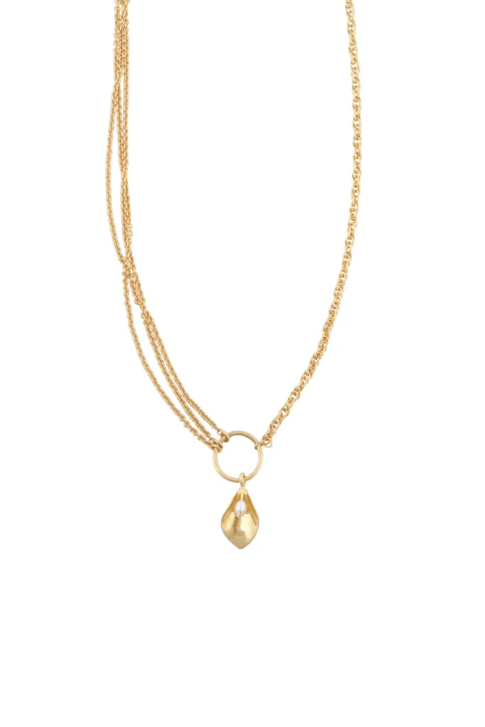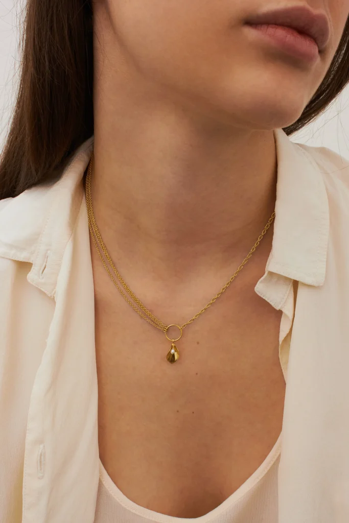 Un collar de plata con diferentes cadenas y un colgante con anilla y motivo vegetal con perla de río. Tres cadenas finas y una gruesa para darle movimiento y un toque diferente.