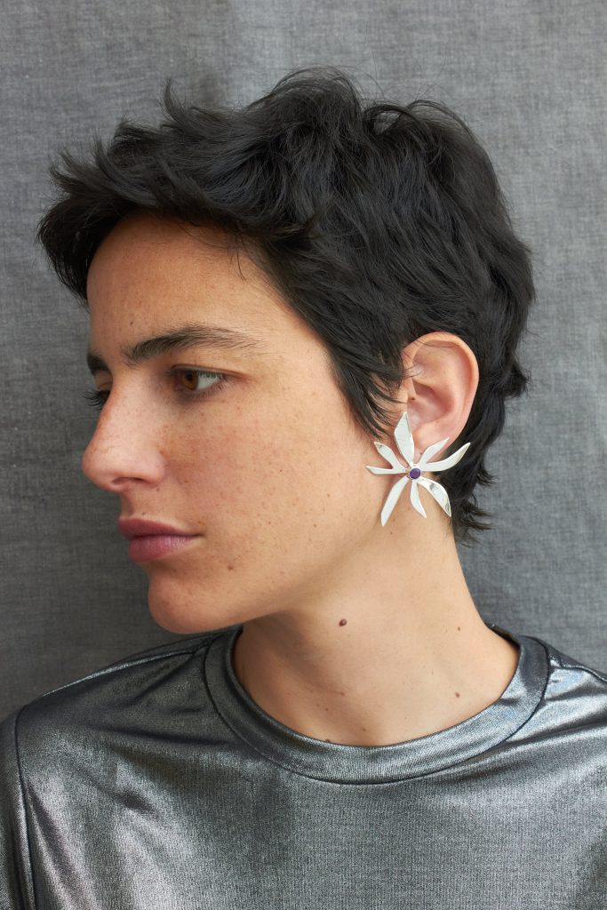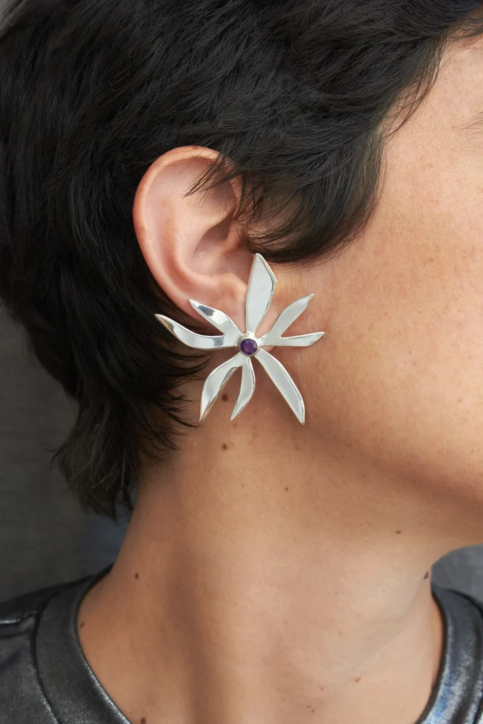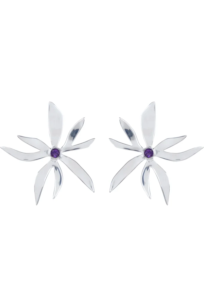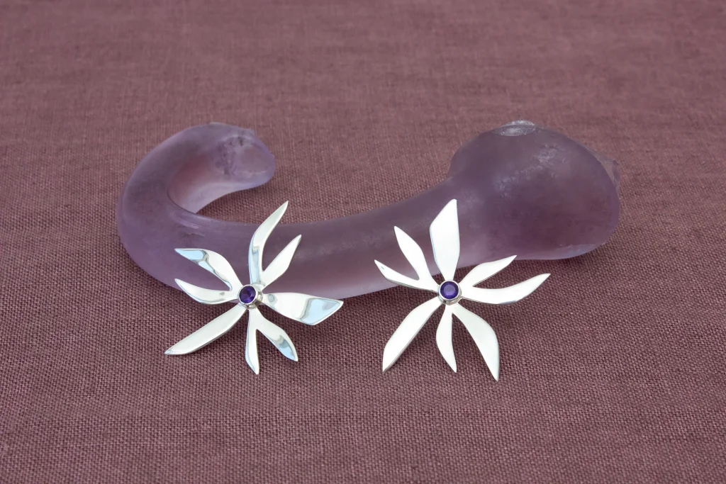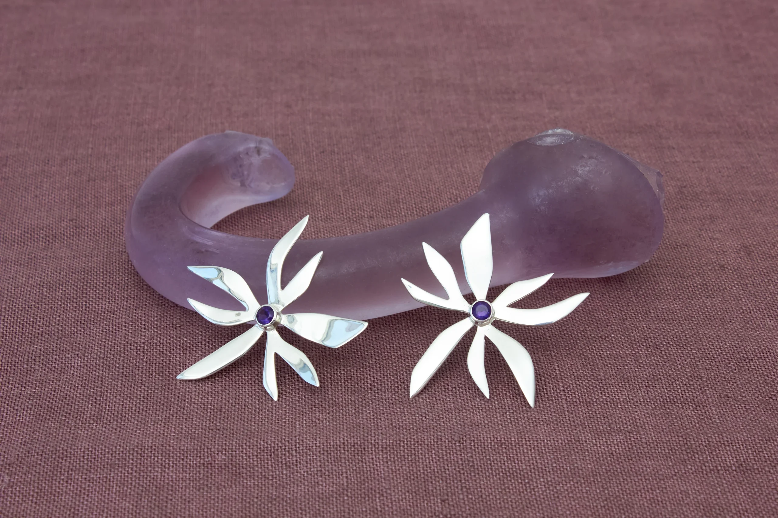 Pendientes grandes con forma de flor, de plata maciza y amatistas engastadas en chatón. Lo pétalos, están curvados en sentido ergonómico, dando a su vez el movimiento que siempre buscamos en nuestras piezas. Son ligeros, como todos los los pendientes de Deassín, y se ajustan con presiones grandes para que se mantengan perfectamente pegados.
