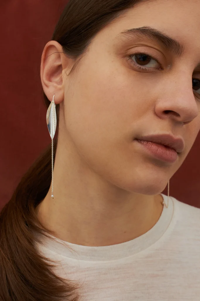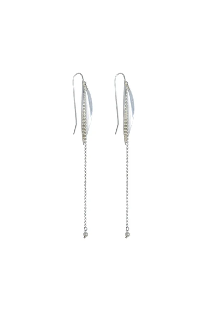 Pendientes con forma de hoja y una cadena fina y larga terminada con una perla. Ligeros, elegante y con el movimiento de cada gesto.